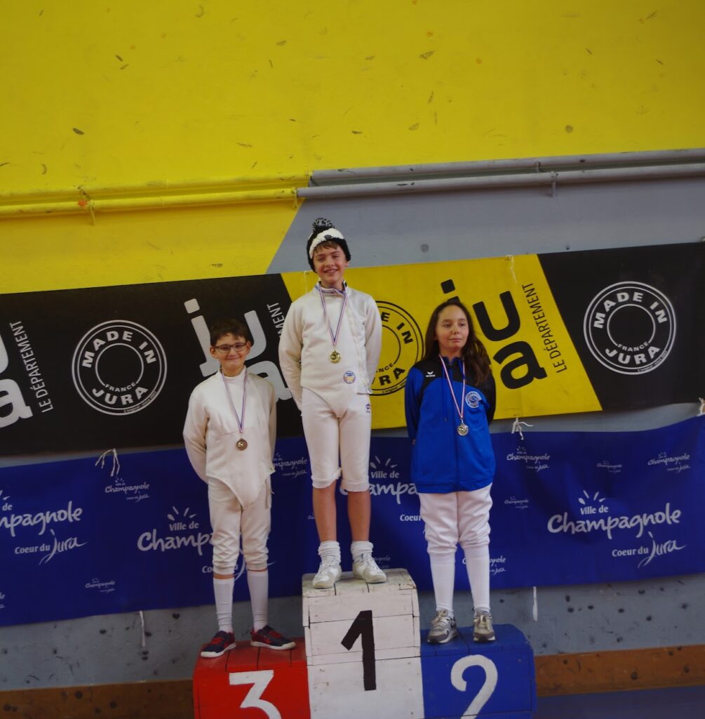En épée M13, nos trois tireurs obtiennent les trois places du podium : Simon sur la plus haute marche, Jonathan sur la secondes, et Samson sur la troisième marche.